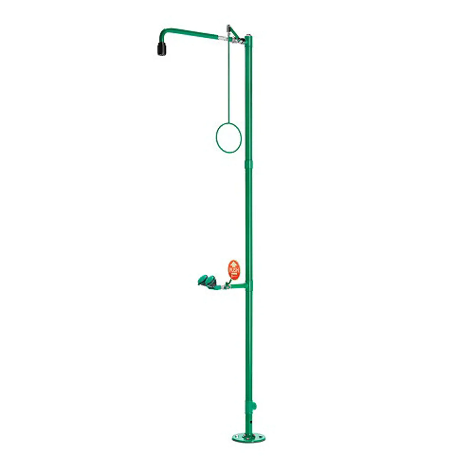 Kombineret krops- og øjenbruser i rustfrit stål med grøn pulverlakering (kemikaliebestandig). Bruseren har integreret regulator, som sikre et flow på 50 l/min ved et tryk på 1,5 - 3 bar. Total højde på 2,3 meter og et udhæng på 65,5 cm. Øjenbruseren har to brusere som er vinklet 45°. Kropsbruseren aktiveres ved at trække i ringen, og øjenbruserne aktiveres ved at trykke på den store knap med påskriften "Push".
