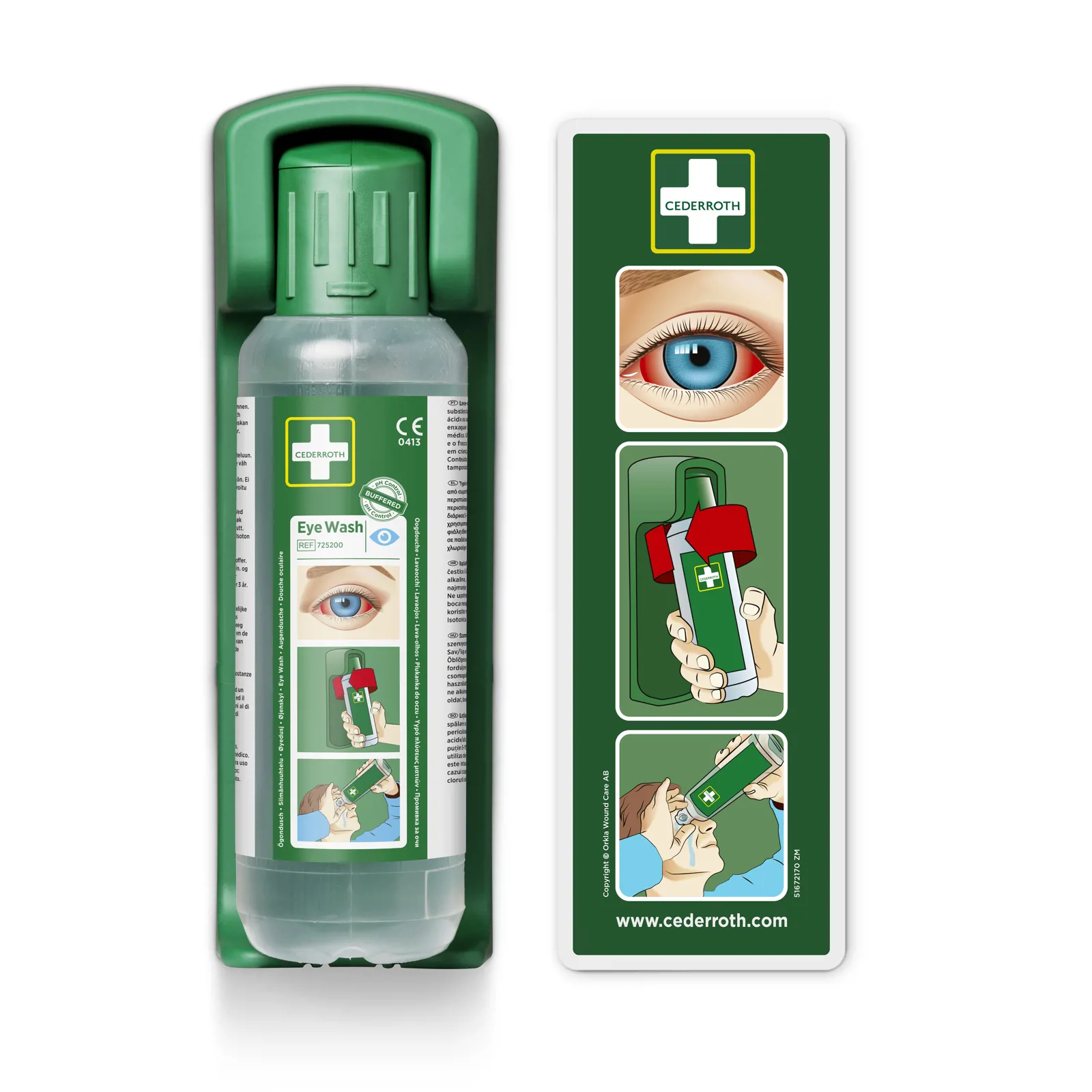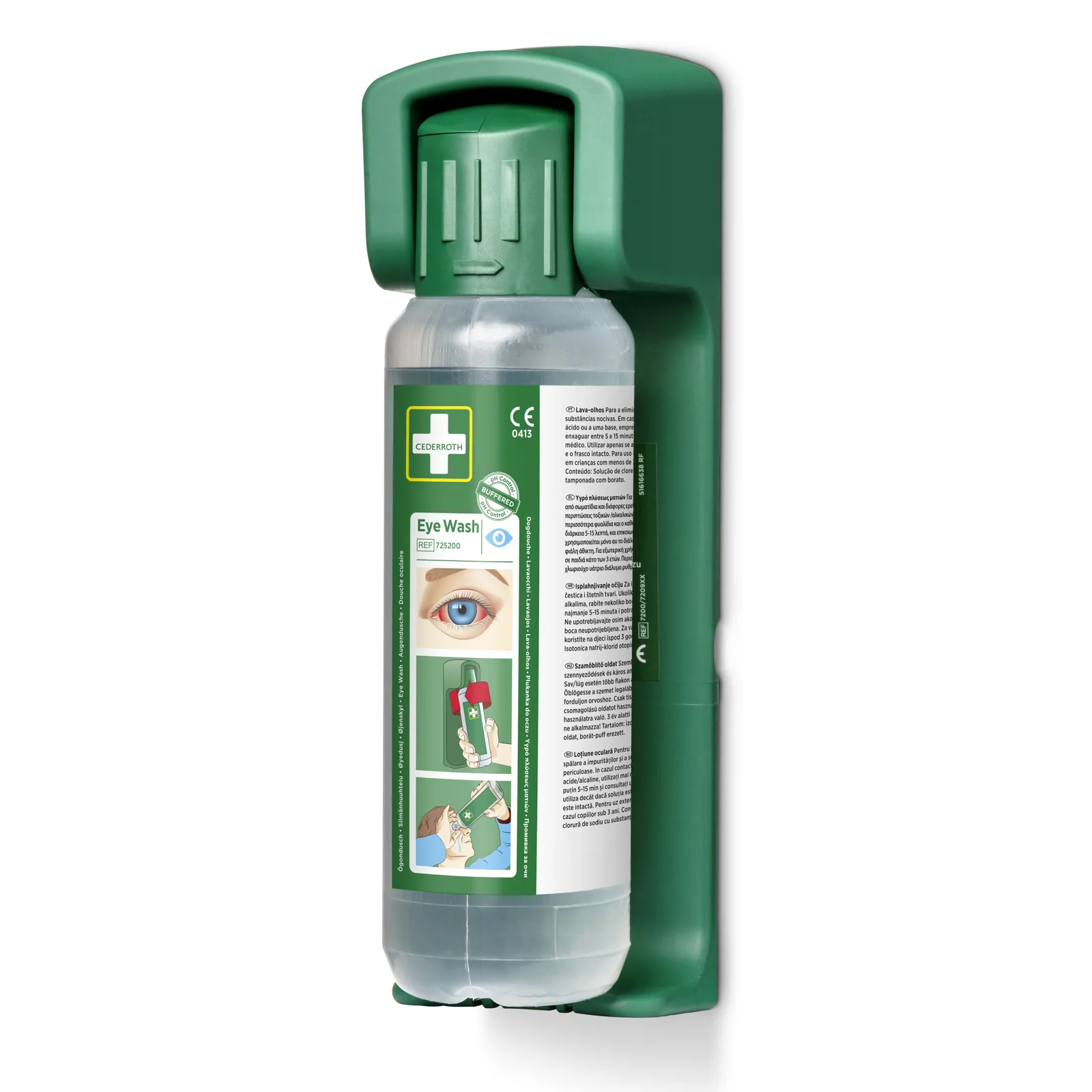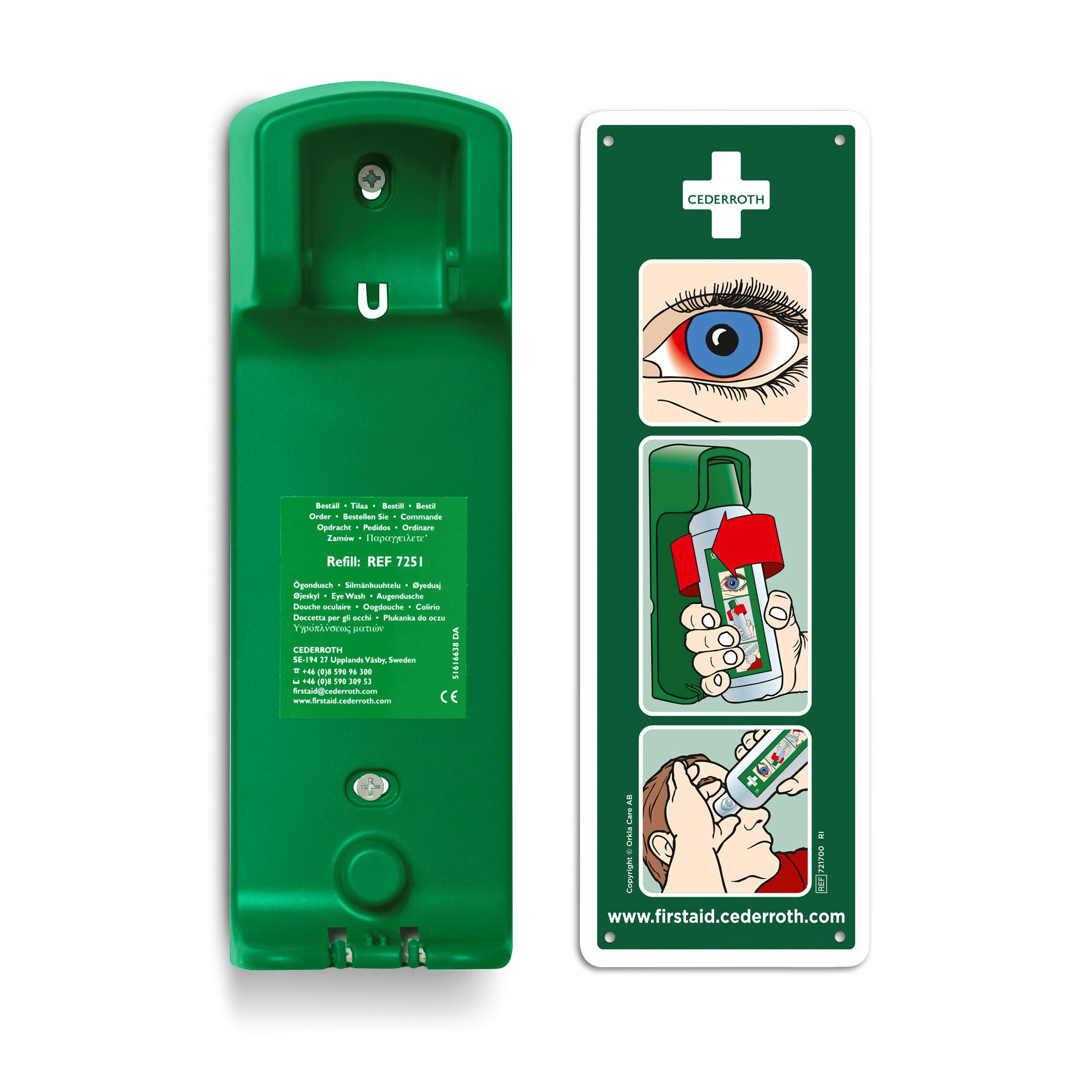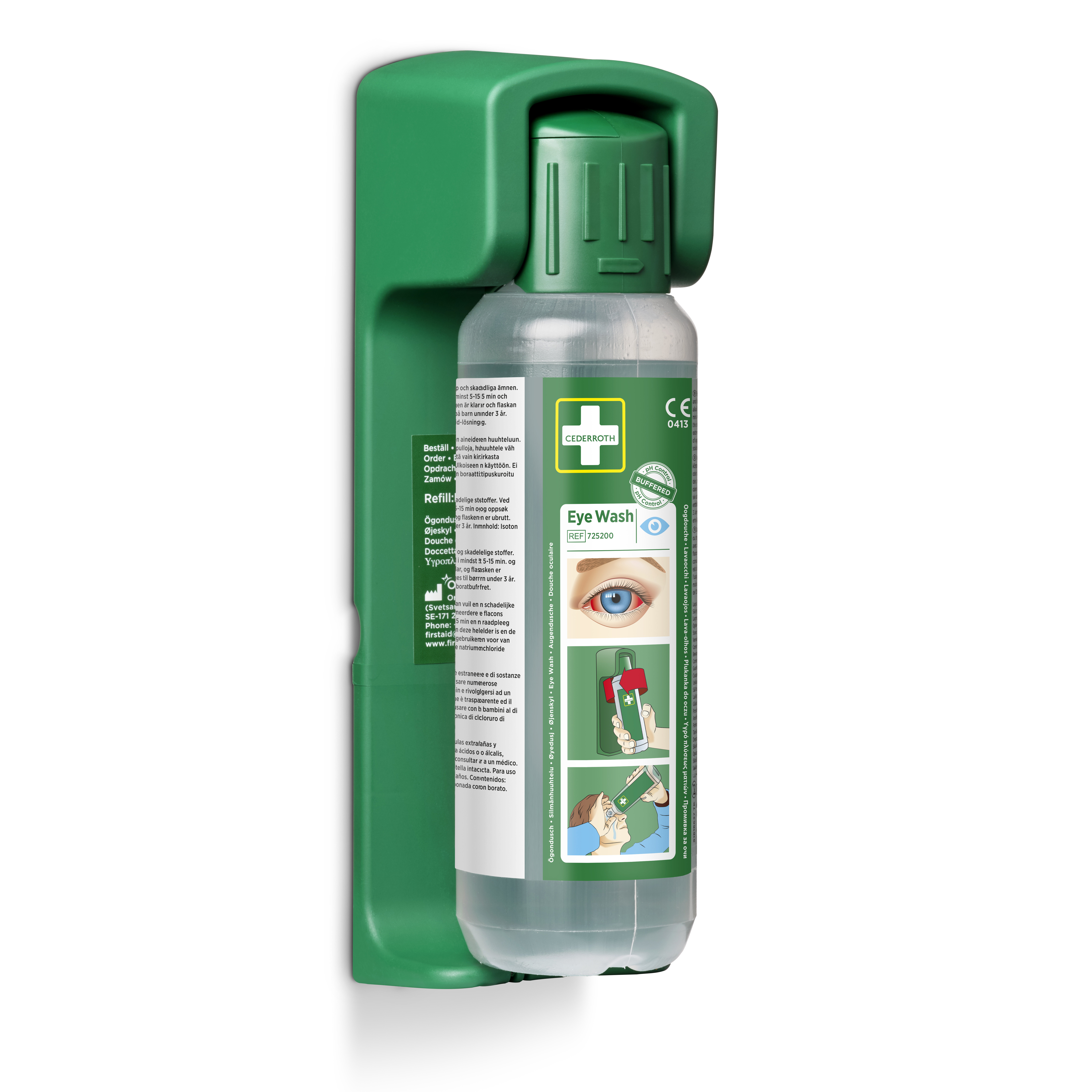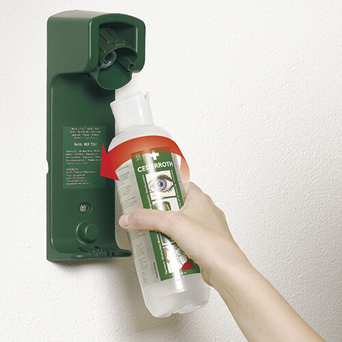 Robust og praktisk vægholder til Cederroth Øjenskyl 500 ml (REF 7251). Med vægholderen får flasken en bestemt plads, så alle ved, hvor den er. Flasken sidder fastlåst i vægholderen og åbnes automatisk, når den vrides ud af holderen – man kan straks begynde at skylle øjet. Kan placeres på flere forskellige måder og passer derfor til alle arbejdspladser og lokaler. Selvlysende instruktionsskilt medfølger.