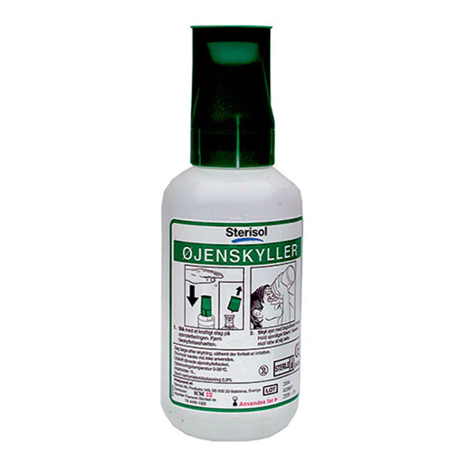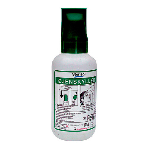 Steril 0.9% NaCl-opløsning i 1 liters flaske. Skylletid 5-7 minutter. Flaskehalsen har øjekop for sikker skylning. Flad bund så flasken kan stå alene. Ny, forbedret støvtæt hætte og åbningsmekanisme. Holdbarhed 3 år fra produktionsdato, udløbsdato angivet på flasken.