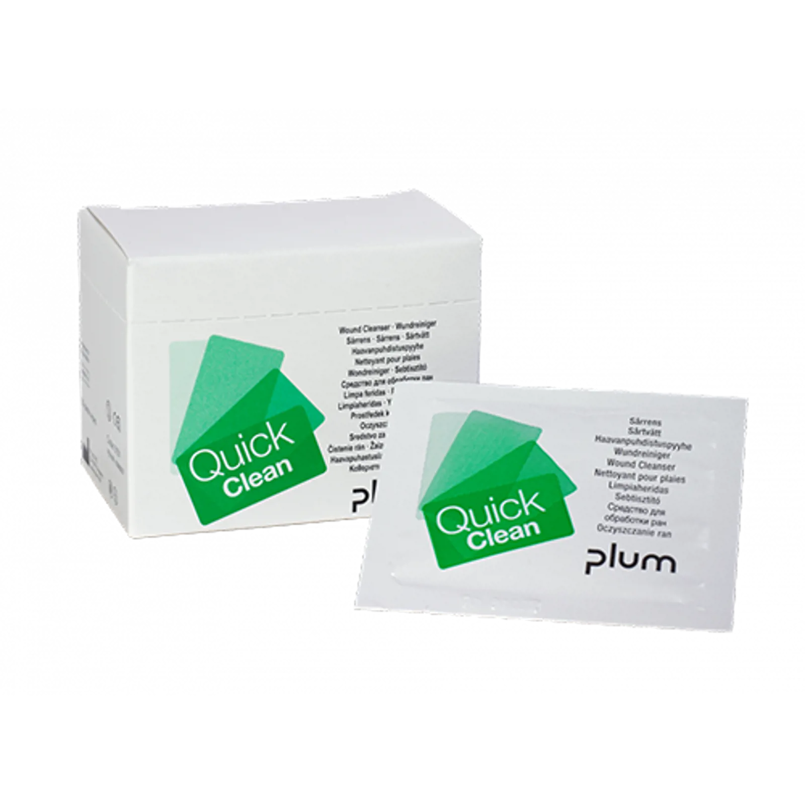 Plum sårrenseservietter til rengøring af små sår og rifter. Servietterne er individuelt pakket med sterilt vand.