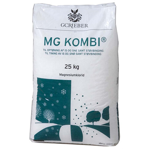 Sne- og issmeltemiddel baseret på magnesiumklorid. Produktet er egnet til brug på frosne tagrender, afløbsrør, trapper, kørebaner, fortov og ramper. Granulatet bruges i koncentrat og skader ikke planter, græs, cement og lignende. Virker 20 gange hurtigere end salt og er effektivt ved temperaturer ned til -45 °C. MG Kombi Prills er desuden yderst velgenet som støvbinder på for eksempel grusveje med mere. Vægt: 25 kg.