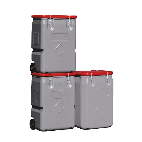 ADR godkendt mobilbox til opbevaring af klude, mopper og så videre med farlige væsker. Ligeledes anvendelig til affald. Let at håndtere ved hjælp af hjul. Lufttæt låg med PU-pakning og låseanordning.