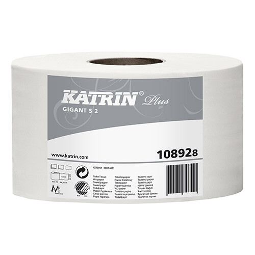 Katrin Gigant Toiletpapir S 2 hvid 2-lags. Svanemærket. Mål: L 160 meter x B 9,8 cm./rulle. Vægt: Cirka 0,590 kg./rulle. Passer til Katrin Gigant S Dispenser.