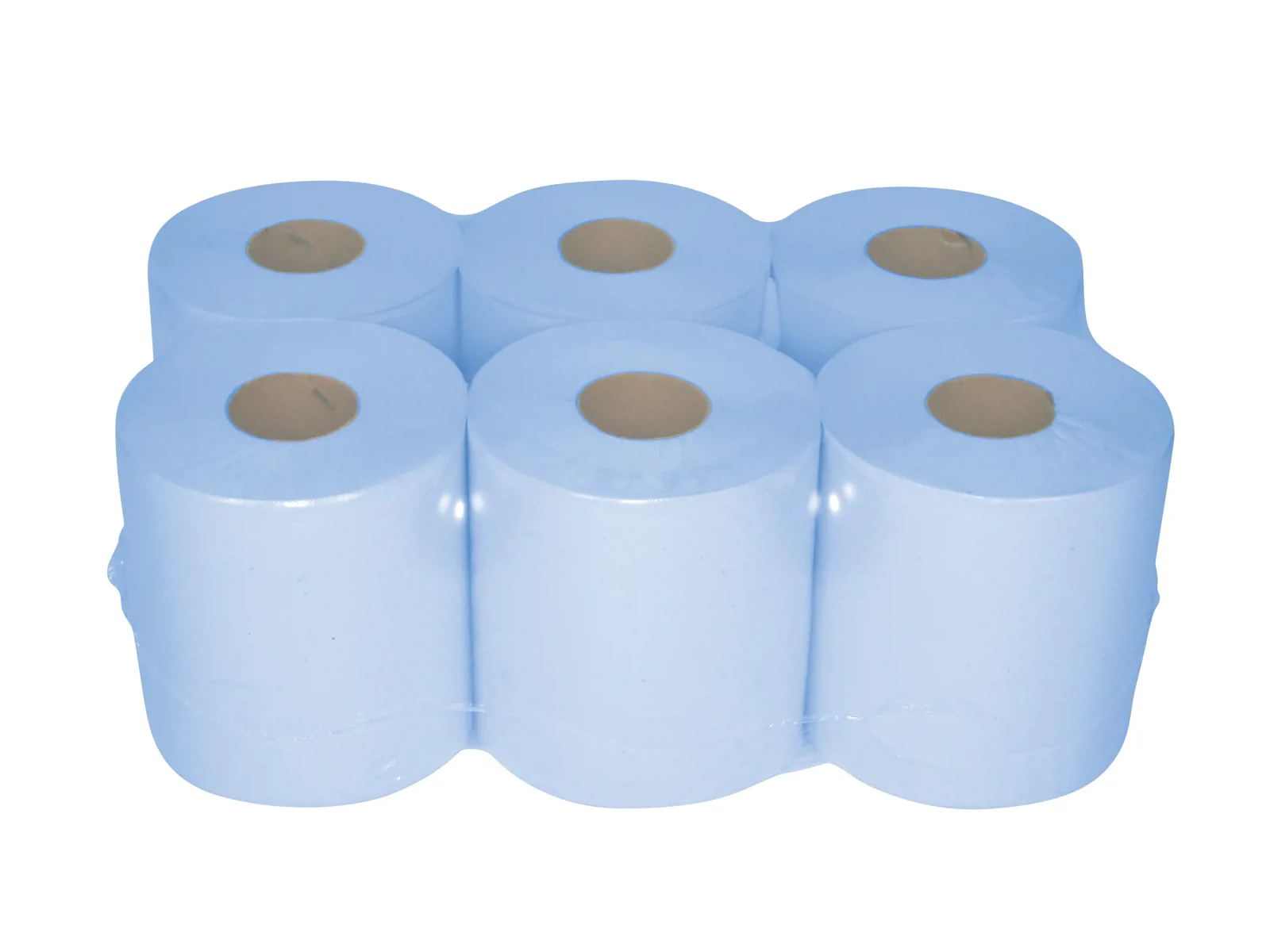Blå håndklæderulle med centertræk. 1-lags genbrugspapir. 6 ruller per pakke.