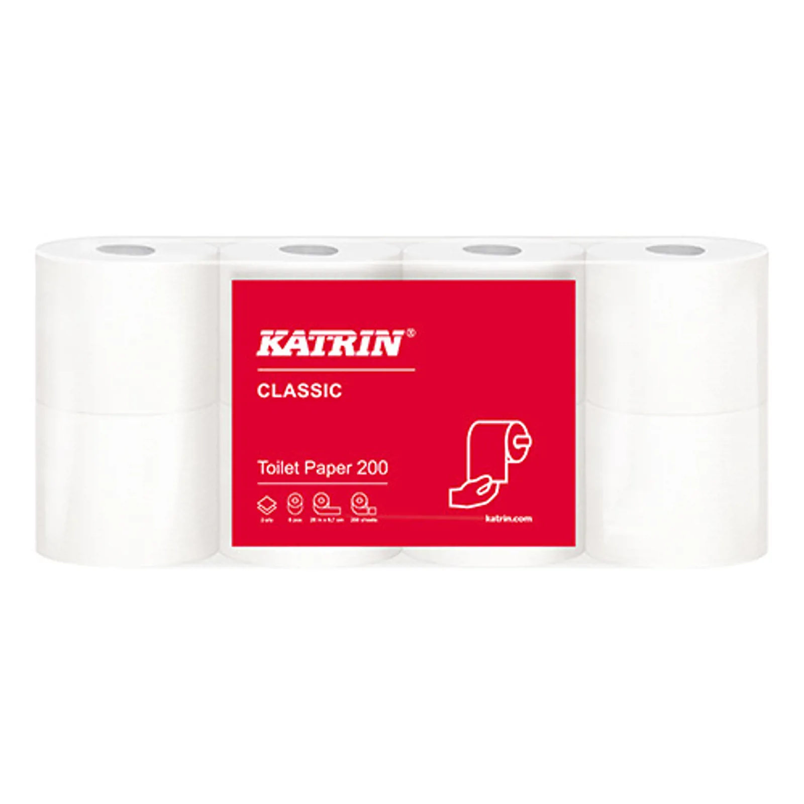 Hvidt 2-lags toiletpapir med 200 ark fra Katrin. Papiret er af stærk kvalitet, samtidigt med at det er blødt, og absorberende for maksimal komfort. Svanemærket.