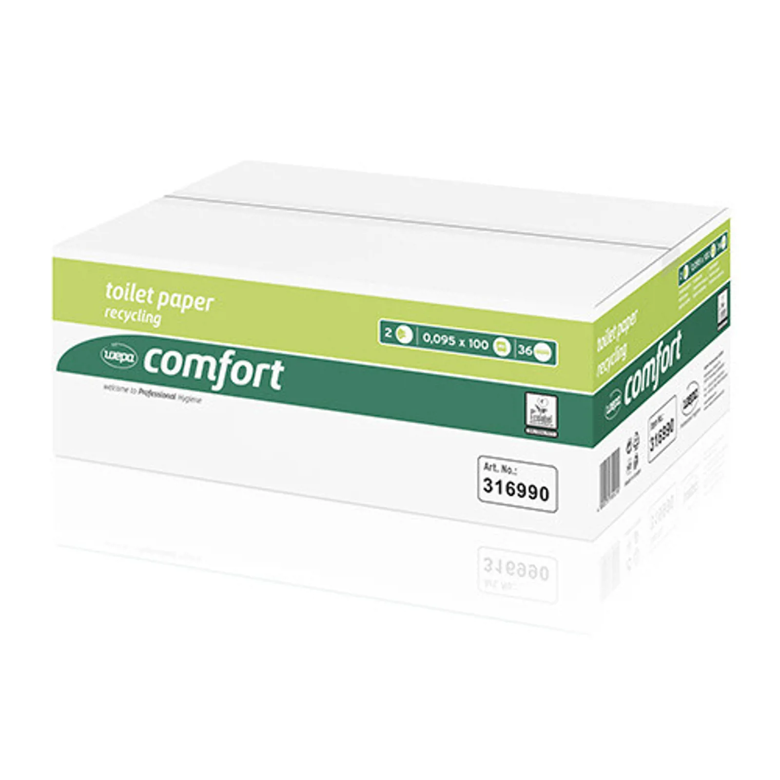 Kvalitets toilet papir lavet af genanvendt materiale. Blødt, miljøvenligt og med god absorberingsevne. Toilet papiret er tildelt EU Ecolabel. Antal: 36 ruller.