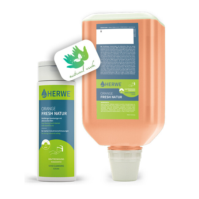 Herwe Orange Fresh Natur en tyktflydende, orange håndrens til kraftig tilsmudsningser, med et bionedbrydeligt naturligt slibemiddel lavet af majskolbemel. Den er behageligt parfumeret og indeholder plejende substanser. Kan rense hårdnakket snavs som olie, fedt og støv, hvorfor den er velegnet til brug indenfor trykkeri, støberi, maskinbyggeri og reperaturværksteder. Stopper ikke afløb eller rør. 2000 ml.