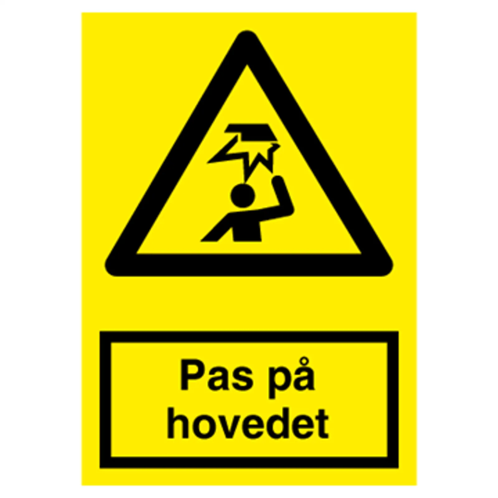 Advarselsskilt med dansk tekst 'Pas på hovedet ' leveres på Selvklæbende vinyl i størrelsen (A4) 297 x 210 mm med Symbol og tekst som følger DS/EN ISO 7010:2011 (Sikkerhedsskilte)