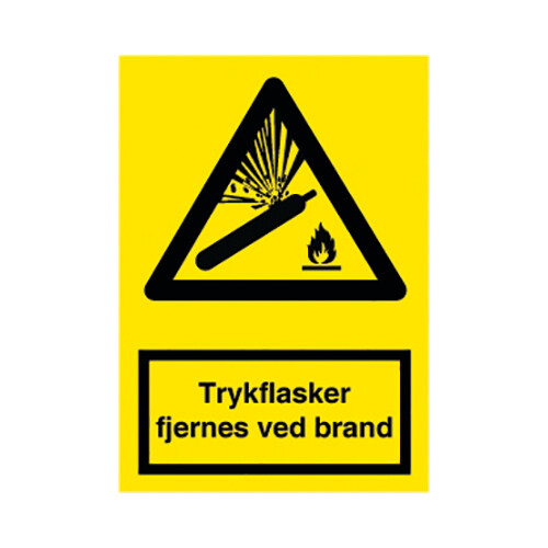 Advarselsskilt med dansk tekst "Trykflasker fjernes ved brand" leveres på selvklæbende vinyl i størrelsen (A4) 297 x 210 mm. med symbol og tekst som følger DS/EN ISO 7010:2011 (sikkerhedsskilte).