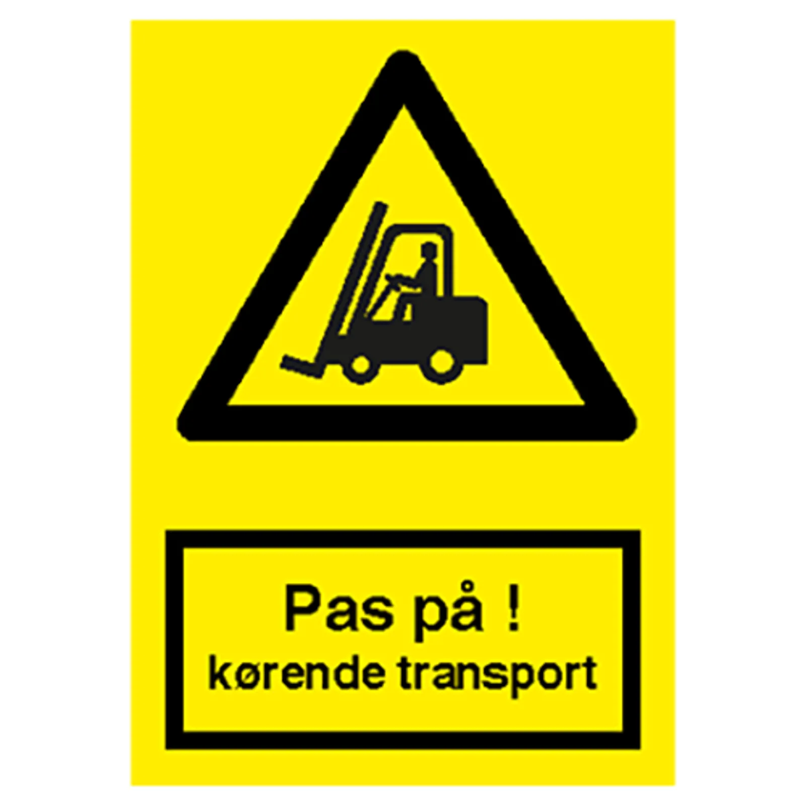 Advarselsskilt med dansk tekst "Pas på kørende transport" leveres på plast i størrelsen (A4) 297 x 210 mm. med symbol og tekst.