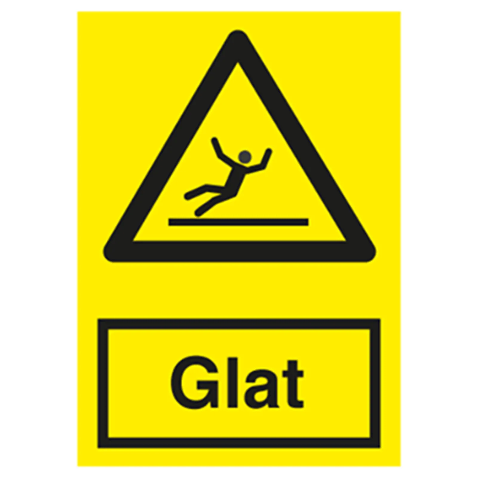 Advarselsskilt med symbol og dansk tekst "Glat" leveres på selvklæbende vinyl i størrelsen (A4) 297 x 210 mm.