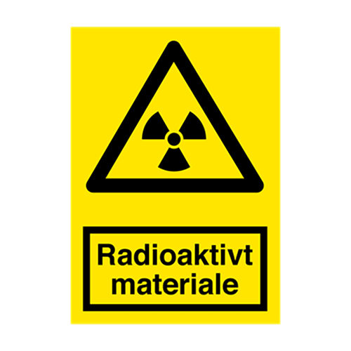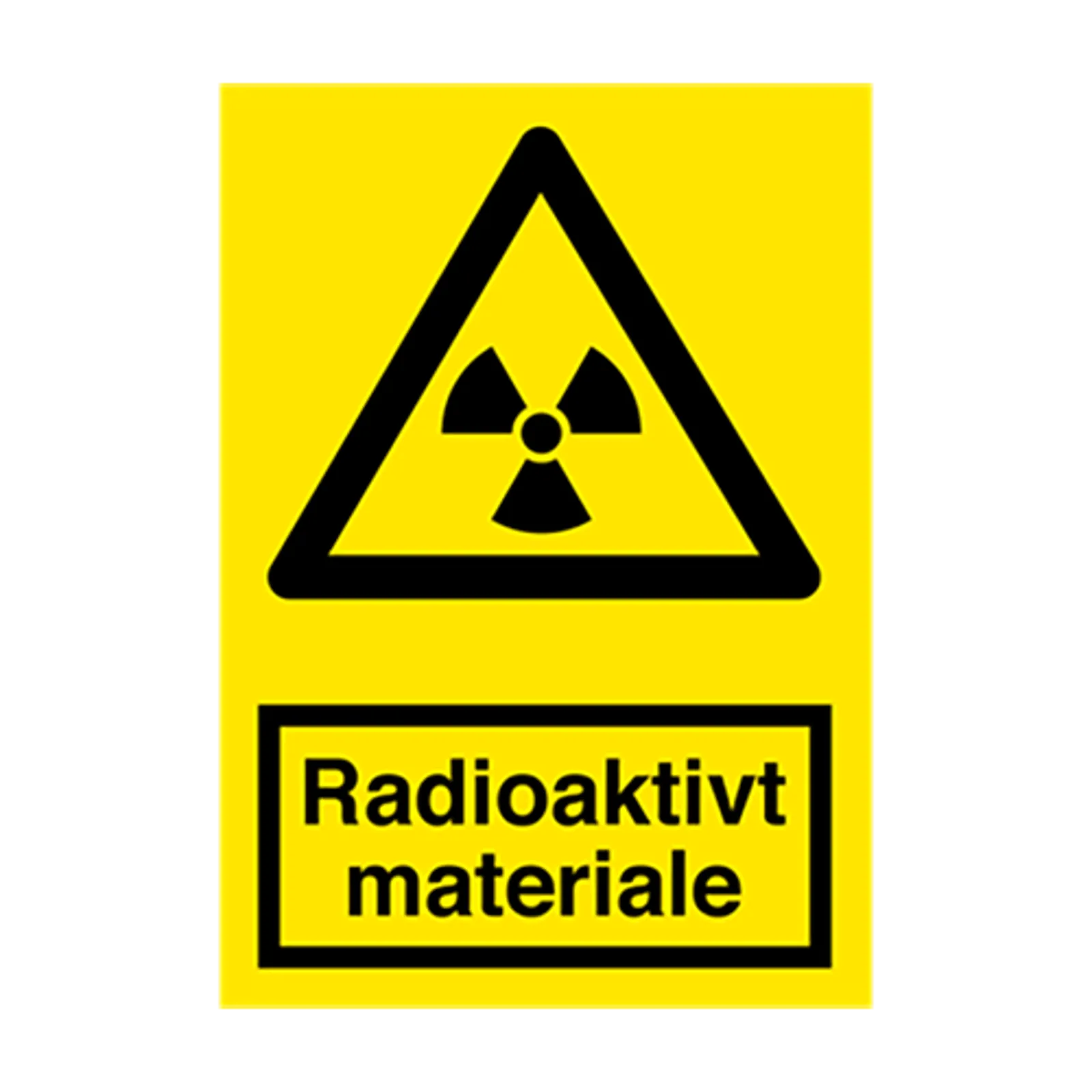 Advarselsskilt med symbol og dansk tekst "Radioaktivt materiale" leveres på refleks alu. i størrelsen (A4) 297 x 210 mm.