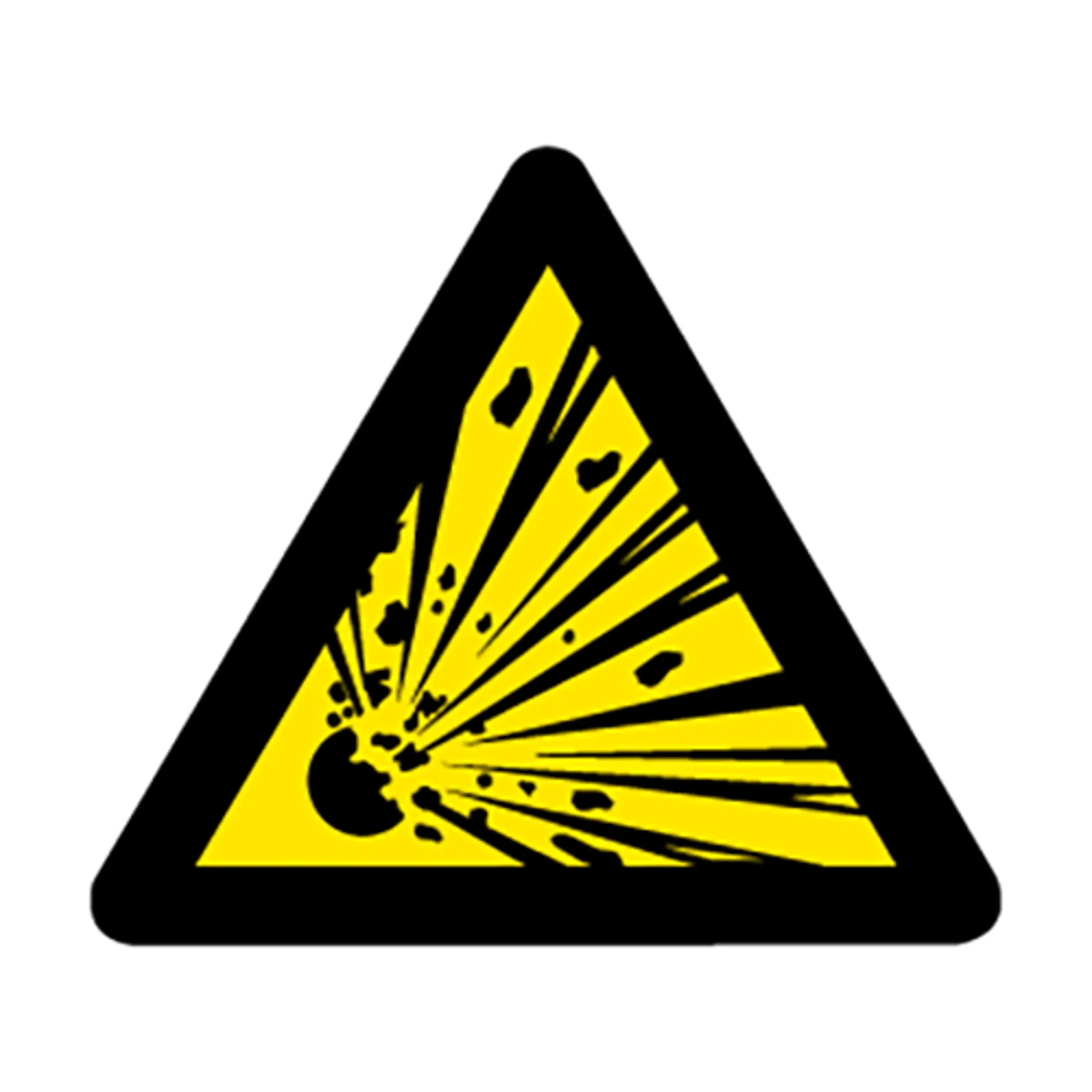 Advarselsskilt med symbol for "Eksplosionsfare". Materiale: Reflekterende aluminium i størrelsen 3x325 mm.