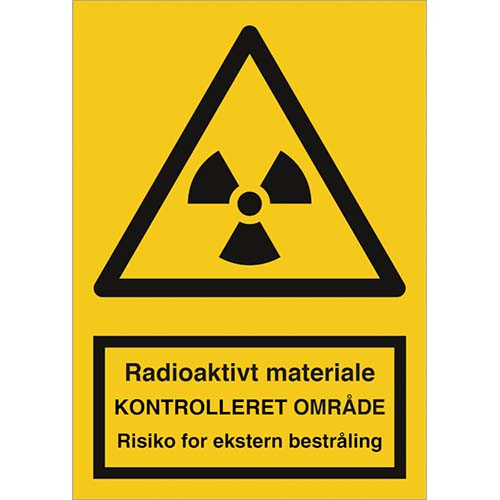 Advarselsskilt med dansk tekst "Radioaktivt materiale - Kontrolleret område - Risiko for ekstern bestråling" leveres på selvklæbende vinyl i størrelsen (A4) 297 x 210 mm.