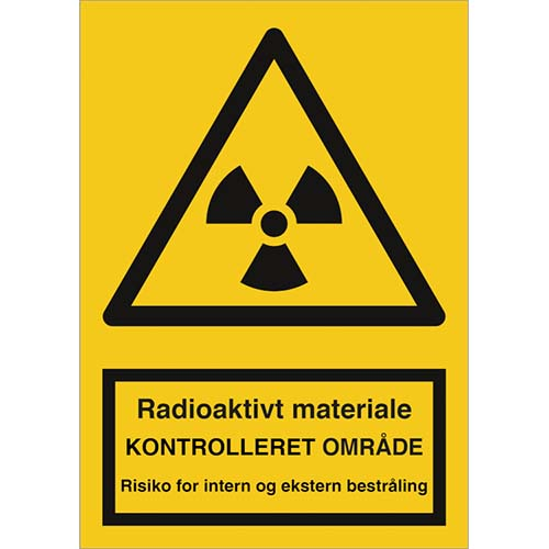 Advarselsskilt med dansk tekst "Radioaktivt materiale - Kontrolleret område - Risiko for intern og ekstern bestråling" leveres på selvklæbende vinyl i størrelsen (A4) 297 x 210 mm.