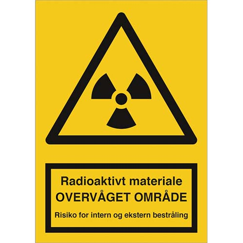 Advarselsskilt med dansk tekst "Radioaktivt materiale - Overvåget område - Risiko for intern og ekstern bestråling" leveres på selvklæbende vinyl i størrelsen (A4) 297 x 210 mm.