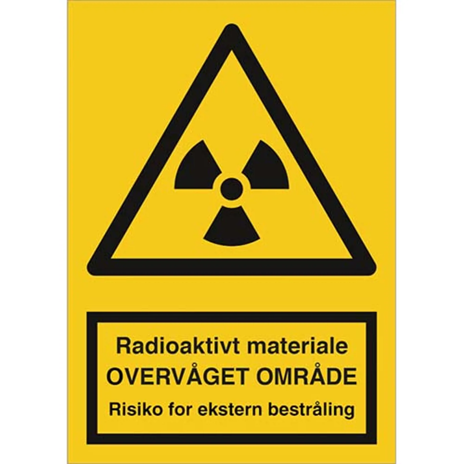 Advarselsskilt med dansk tekst "Radioaktivt materiale - Overvåget område - Risiko for ekstern bestråling" leveres på selvklæbende vinyl i størrelsen (A4) 297 x 210 mm.