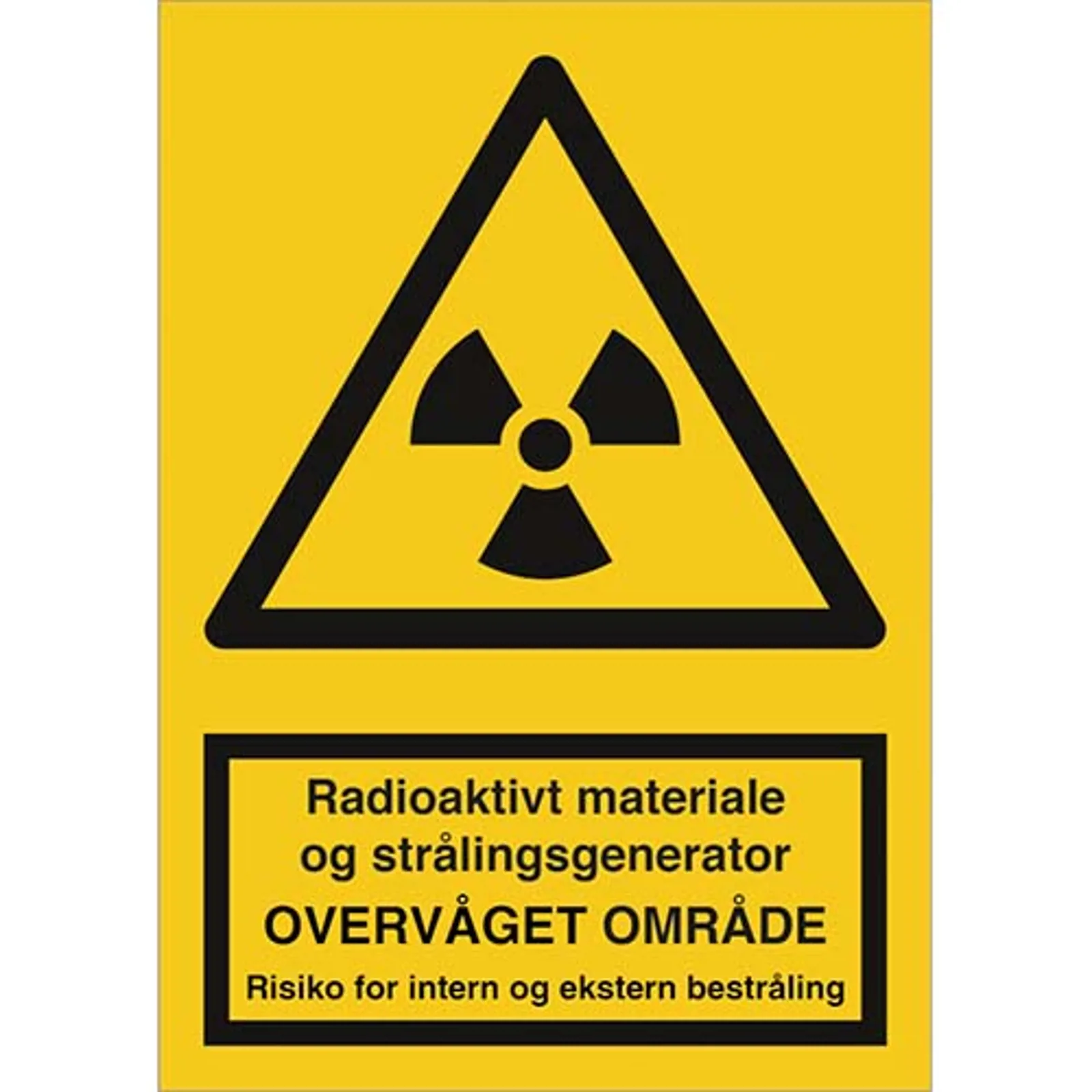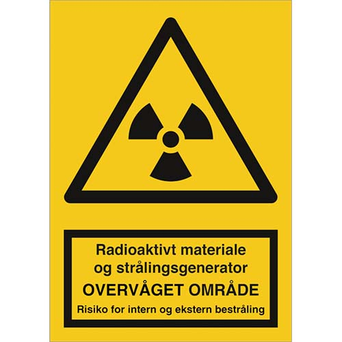 Advarselsskilt med dansk tekst "Radioaktivt materiale og strålingsgenerator - Overvåget område - Risiko for intern og ekstern bestråling" leveres på selvklæbende vinyl i størrelsen (A4) 297 x 210 mm.