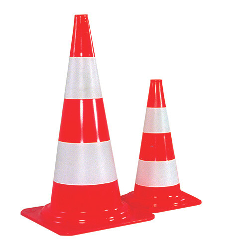 Stabelbare afmærkningskegler, rød med 2 hvide malede bånd. Fremstillet i PVC.