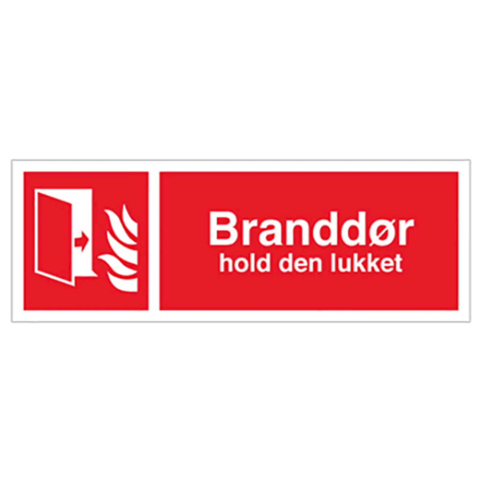 Brandskilt med dansk tekst 'Branddør Hold den lukket ' leveres på Plast i størrelsen (½A3) 140 x 420 mm med Symbol og tekst som følger DS/EN ISO 7010:2011 (Sikkerhedsskilte)