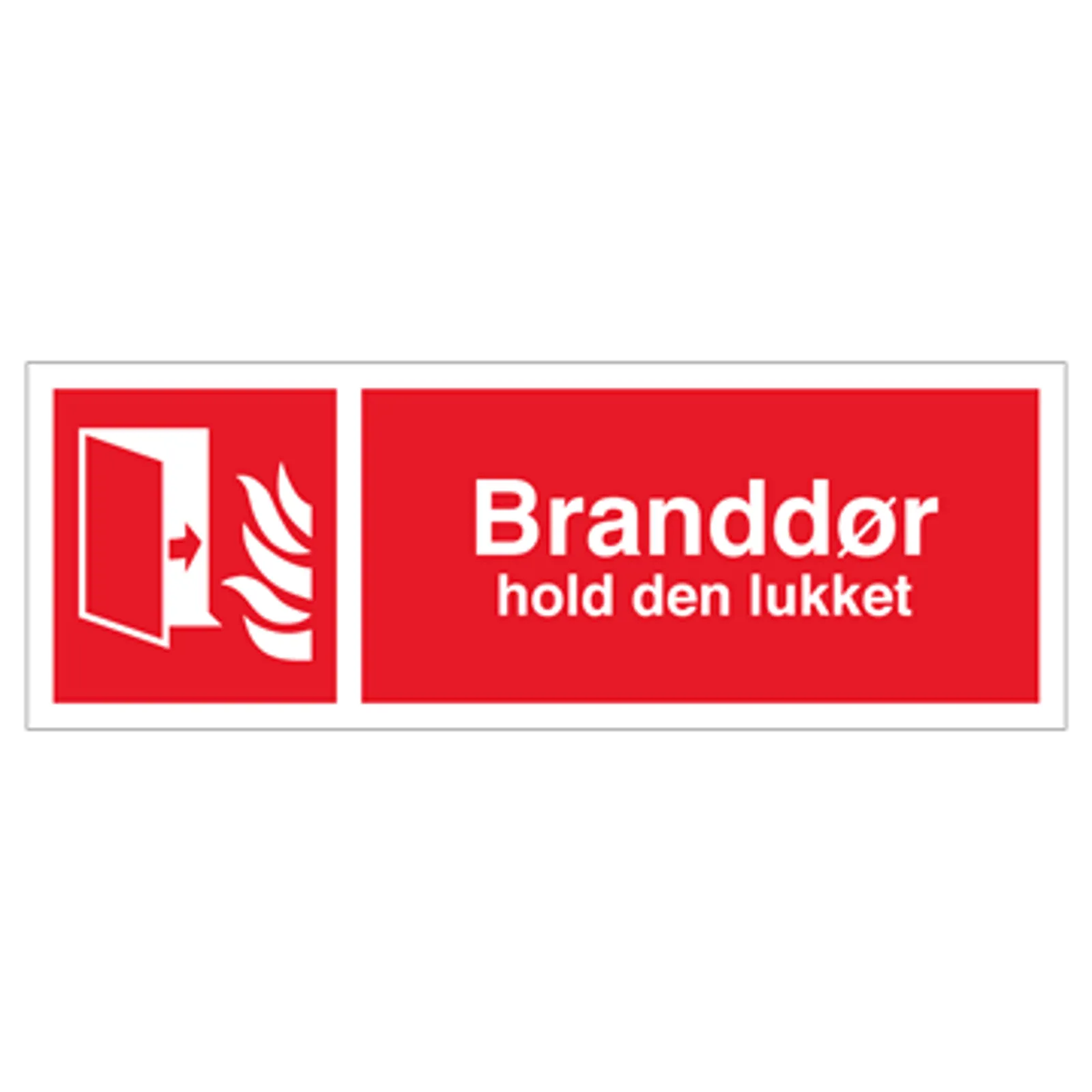 Brandskilt med dansk tekst 'Branddør Hold den lukket ' leveres på Selvklæbende vinyl i størrelsen 75 x 210 mm med Symbol og tekst som følger DS/EN ISO 7010:2011 (Sikkerhedsskilte)