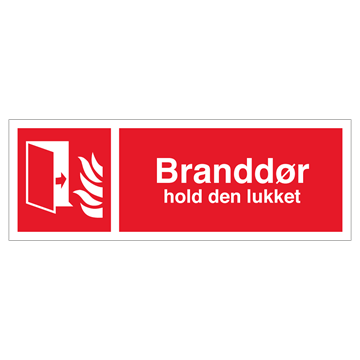 Brandskilt med dansk tekst 'Branddør Hold den lukket ' leveres på Selvklæbende vinyl i størrelsen 50 x 155 mm med Symbol og tekst som følger DS/EN ISO 7010:2011 (Sikkerhedsskilte)