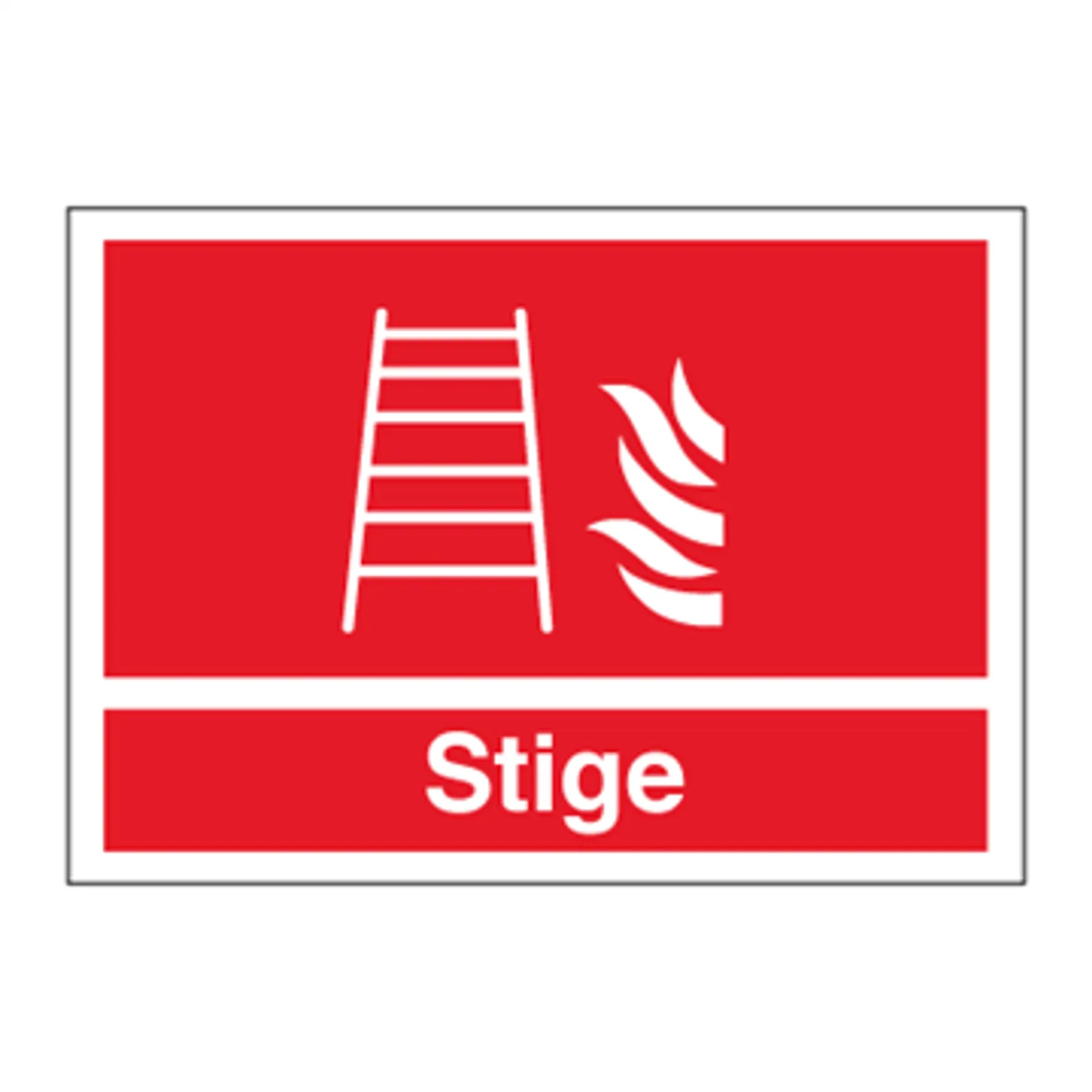 Brandskilt med dansk tekst 'Stige ' leveres på Plast i størrelsen (A4) 210 x 297 mm med Symbol og tekst som følger DS/EN ISO 7010:2011 (Sikkerhedsskilte)