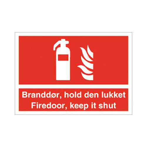 Brandskilt med dansk/engelsk tekst 'Branddør, hold den lukket/Firedoor, keep it shut' leveres på Refleksvinyl i størrelsen 210 x 148 mm med Symbol og tekst som følger DS/EN ISO 7010:2011 (Sikkerhedsskilte)