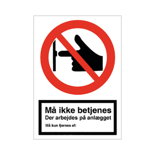 Forbudsskilt med dansk tekst "Må ikke betjenes - Der arbejdes på anlægget - Må kun fjernes af" leveres på plast med snor i størrelsen (A5) 210 x 148 mm. med symbol og tekst på dansk.