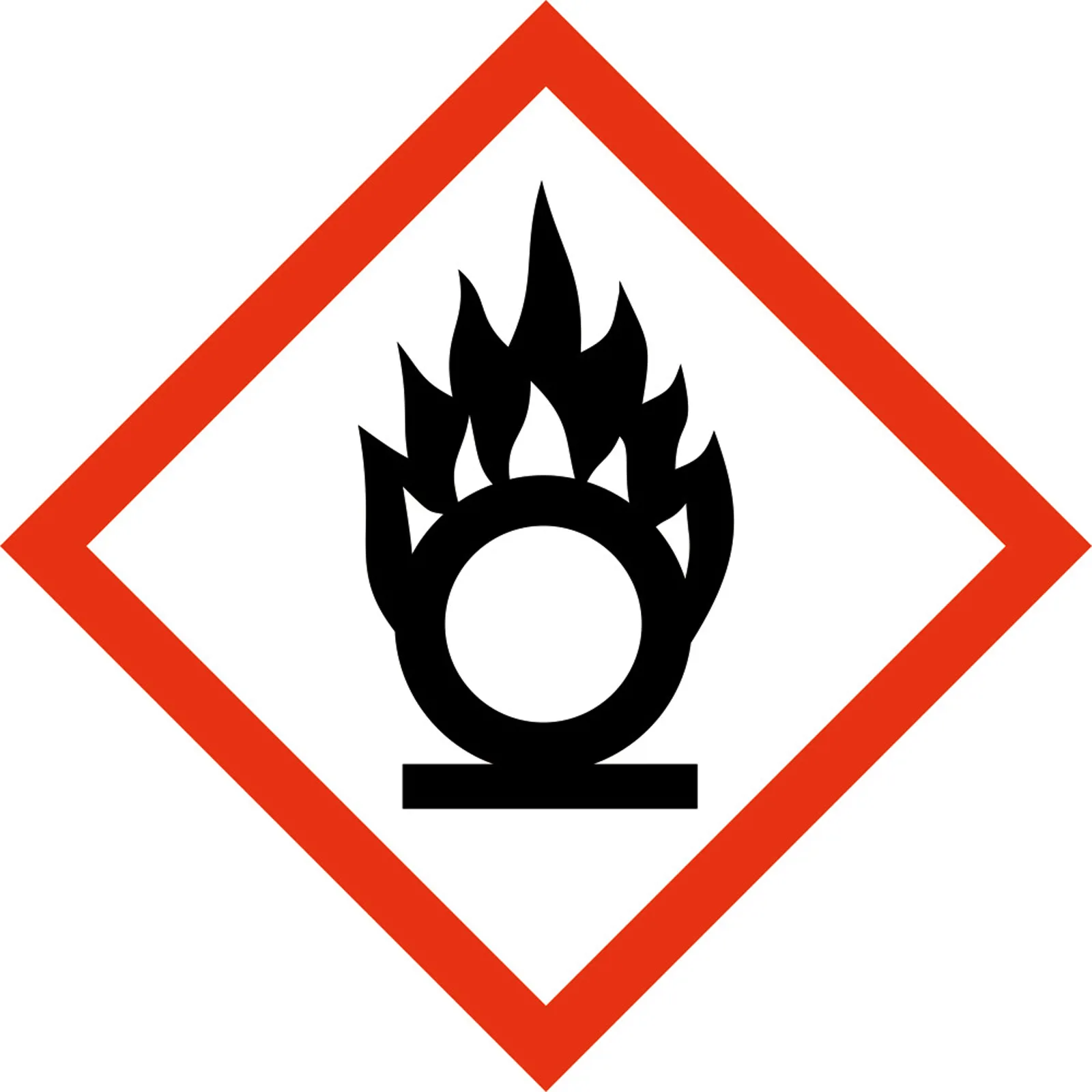GHS skilt med symbol for "Brandnærende" leveres på selvklæbende vinyl i størrelsen 30 x 30 mm. Rulle à 250 stk. med symbol som følger GHS (Rev.7) (2017).