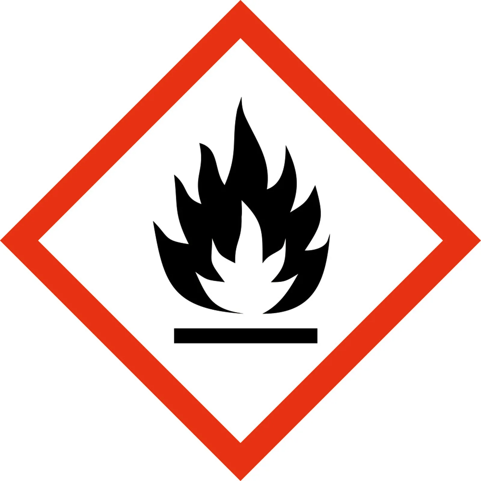 GHS skilt med symbol for "Brandfarlig GHS" leveres på selvklæbende vinyl i størrelsen 30 x 30 mm. Rulle à 250 stk. med symbol som følger GHS (Rev.7) (2017).