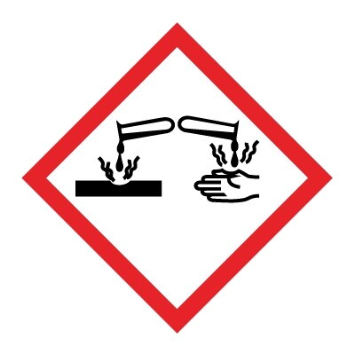 GHS skilt med symbol for "Ætsende" leveres på selvklæbende vinyl i størrelsen 30 x 30 mm. Rulle à 250 stk. med symbol som følger GHS (Rev.7) (2017).