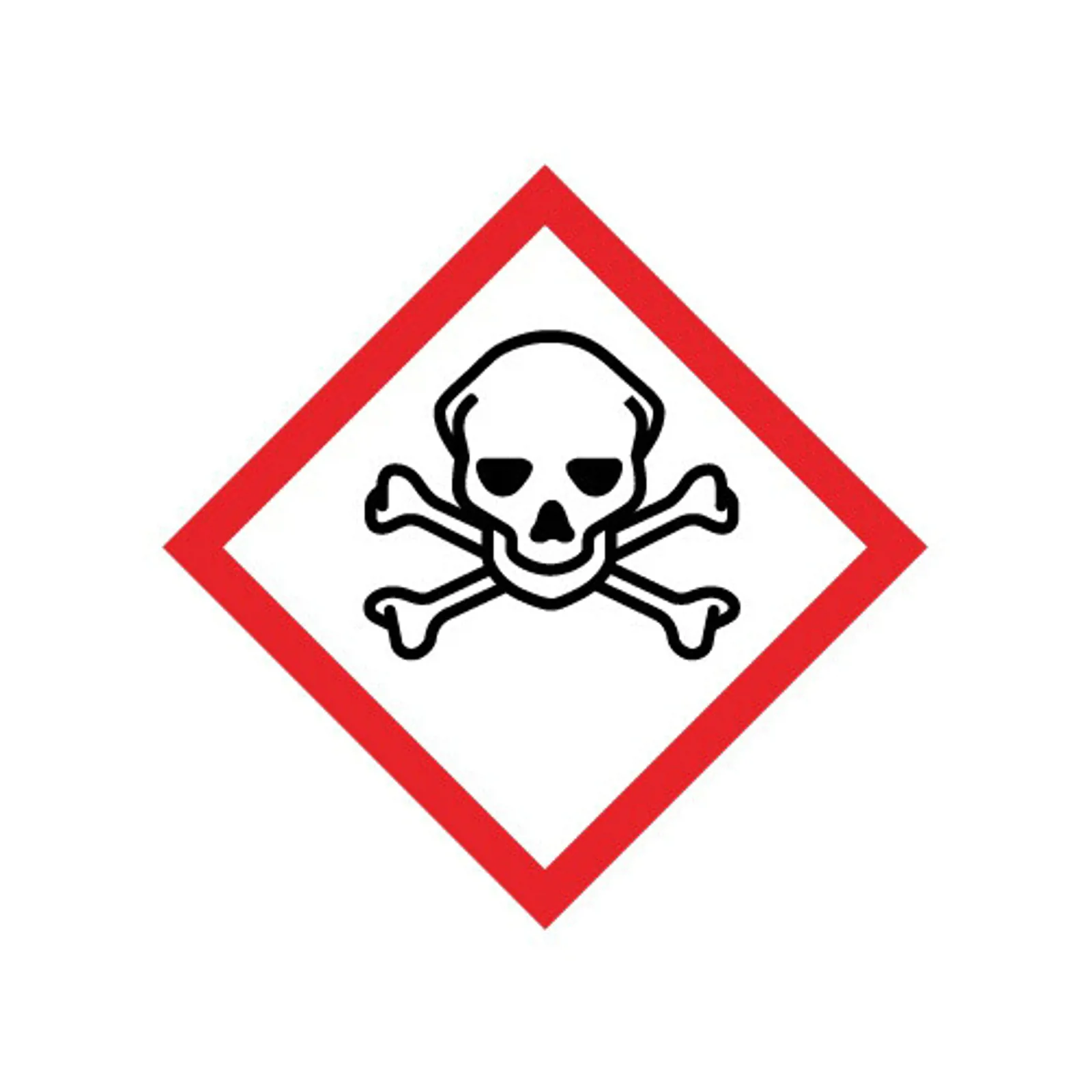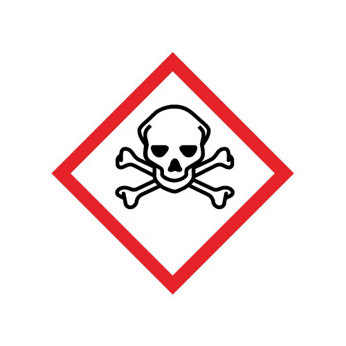 GHS skilt med symbol for "Meget giftig" leveres på selvklæbende vinyl i størrelsen 15 x 15 mm. Rulle á 250 stk. med symbol som følger GHS (Rev.7) (2017).