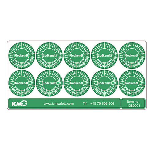Kalibreringsmærke med dansk tekst "Godkendt" leveres på selvklæbende vinyl i størrelsen Ø30 mm. på ark á 10 stk.