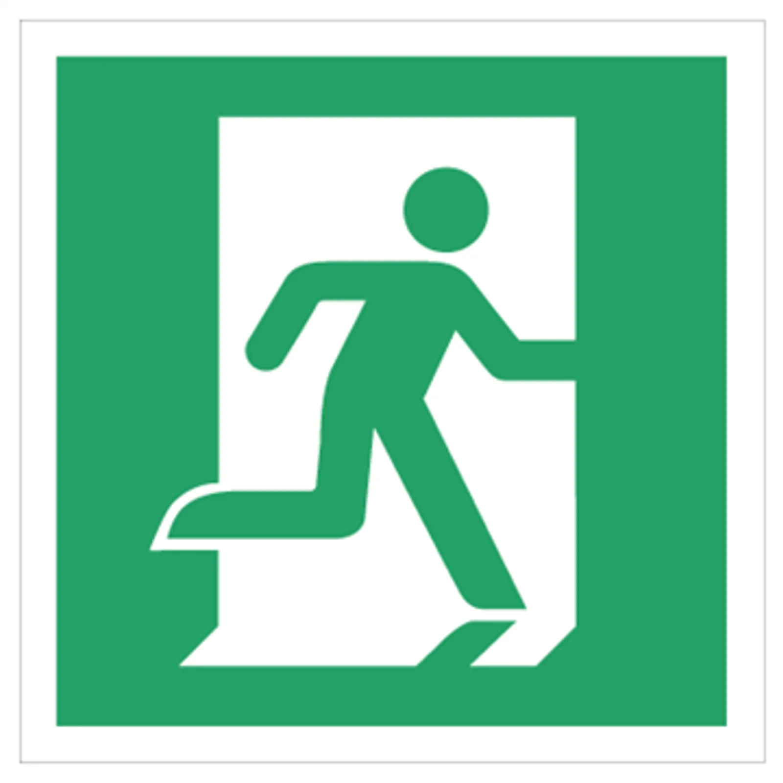 Flugtvejsskilt med symbol for 'Flugtvej højre' leveres på Plast i størrelsen 150 x 150 mm med Symbol som følger DS/EN ISO 7010:2011 (Sikkerhedsskilte)