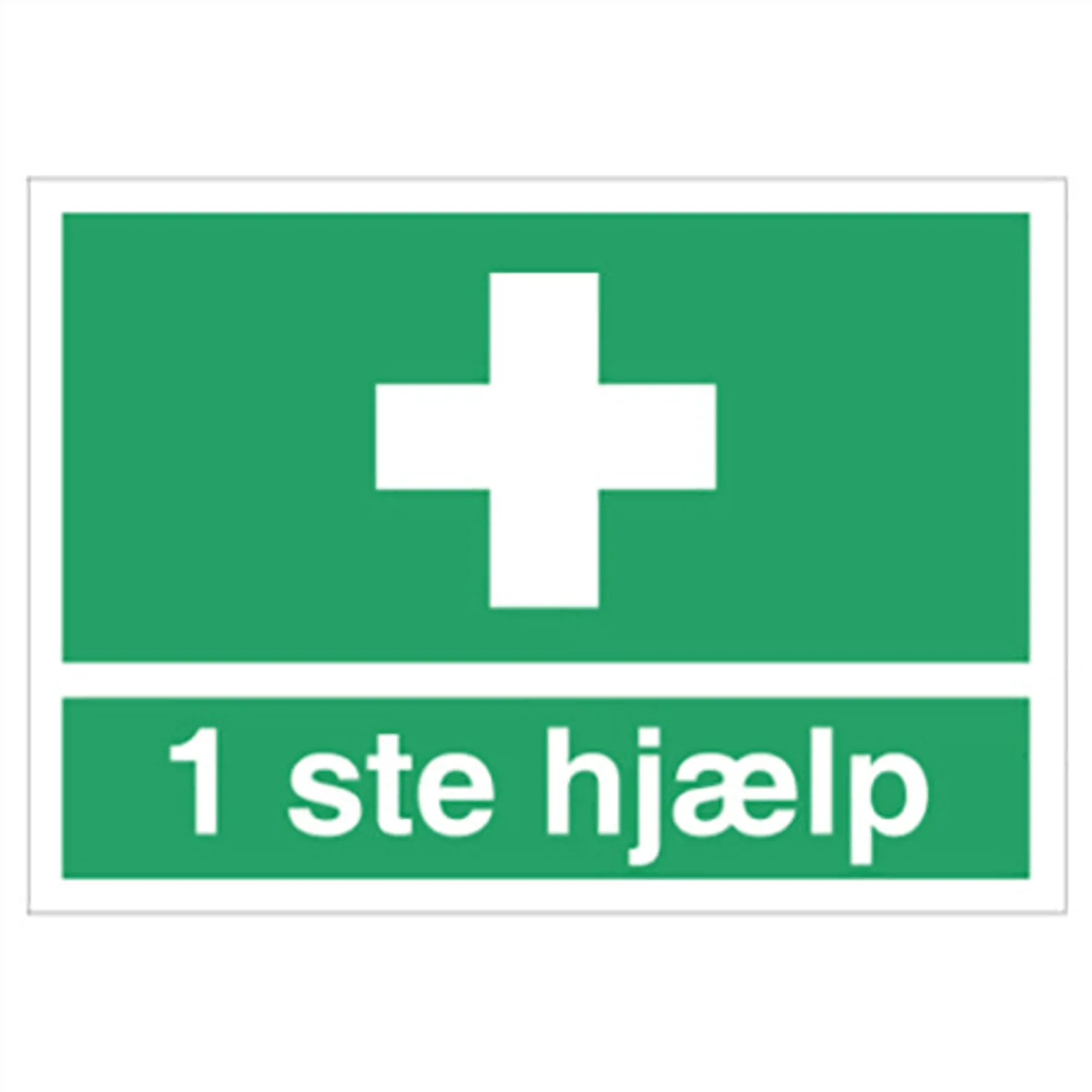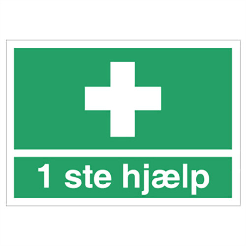 Henvisningskilt med dansk tekst '1 ste hjælp ' leveres på Selvklæbende vinyl i størrelsen (A4) 210 x 297 mm med Symbol og tekst som følger DS/EN ISO 7010:2011 (Sikkerhedsskilte)