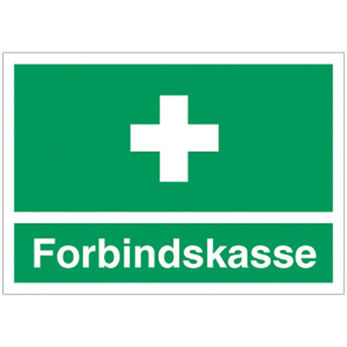 Henvisningskilt med dansk tekst 'Forbindskasse ' leveres på Selvklæbende vinyl i størrelsen (A4) 210 x 297 mm med Symbol og tekst som følger DS/EN ISO 7010:2011 (Sikkerhedsskilte)
