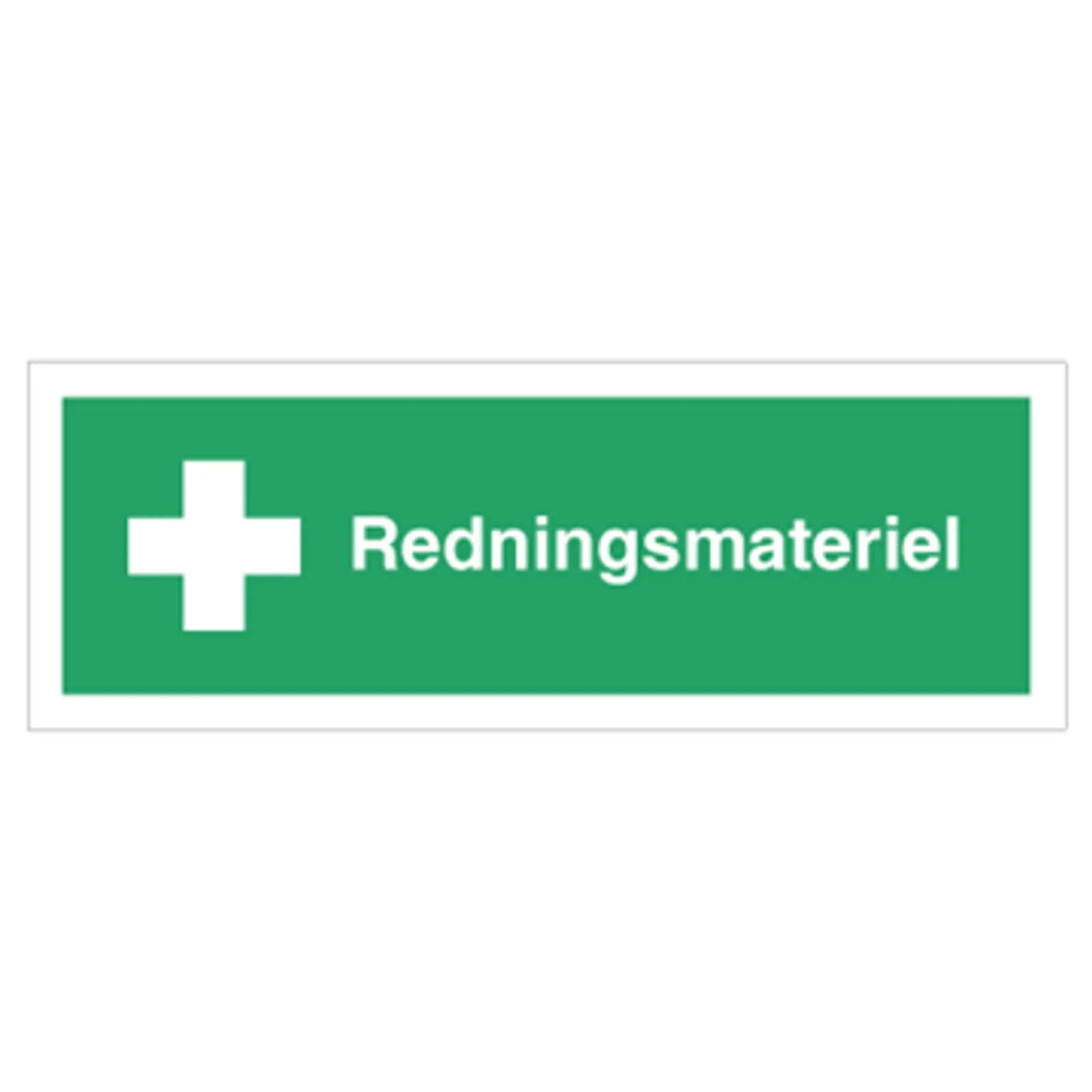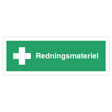 Henvisningskilt med dansk tekst 'Redningsmateriel ' leveres på Selvklæbende vinyl i størrelsen (½A3) 140 x 420 mm med Symbol og tekst som følger DS/EN ISO 7010:2011 (Sikkerhedsskilte)