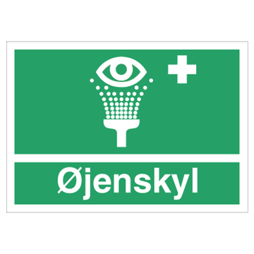 Henvisningskilt med dansk tekst 'Øjenskyl ' leveres på Selvklæbende vinyl l i størrelsen (A6) 105 x 148 mm med Symbol og tekst som følger DS/EN ISO 7010:2011 (Sikkerhedsskilte)
