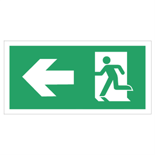 Flugtvejsskilt med symbol og pil for "Flugtvej venstre" leveres på plast i størrelsen 200 x 400 mm. med symbol.