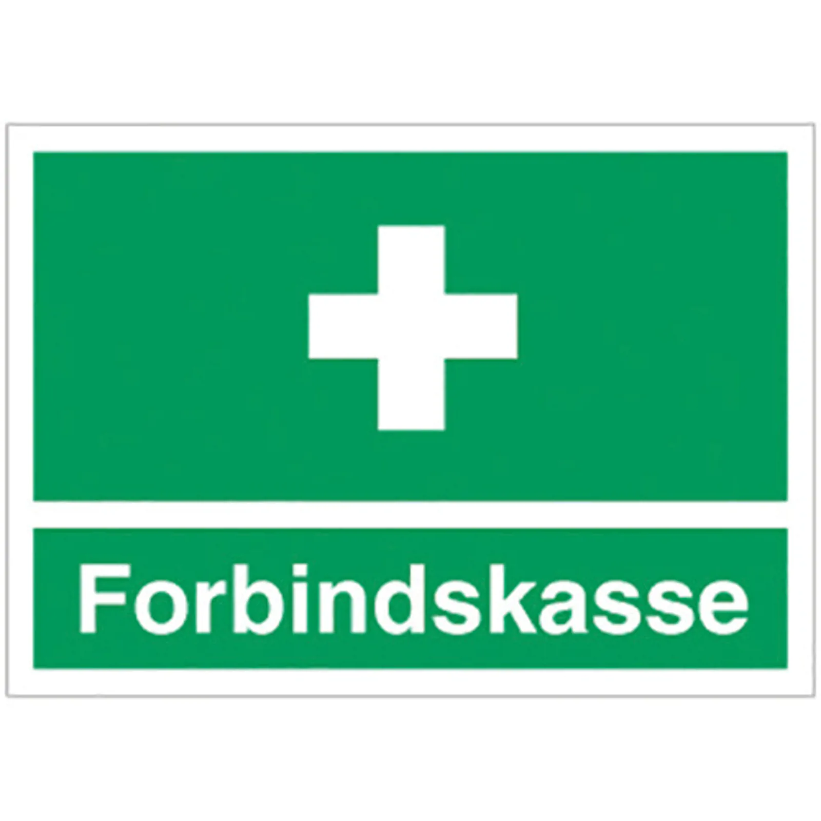 Henvisningskilt med dansk tekst "Forbindskasse" leveres på plast i størrelsen (A5) 148 x 210 mm. med symbol og tekst.