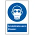Påbudsskilt med dansk tekst "Åndedrætsværn Klasse:" leveres på plast i størrelsen (A4) 297 x 210 mm. med symbol og tekst.