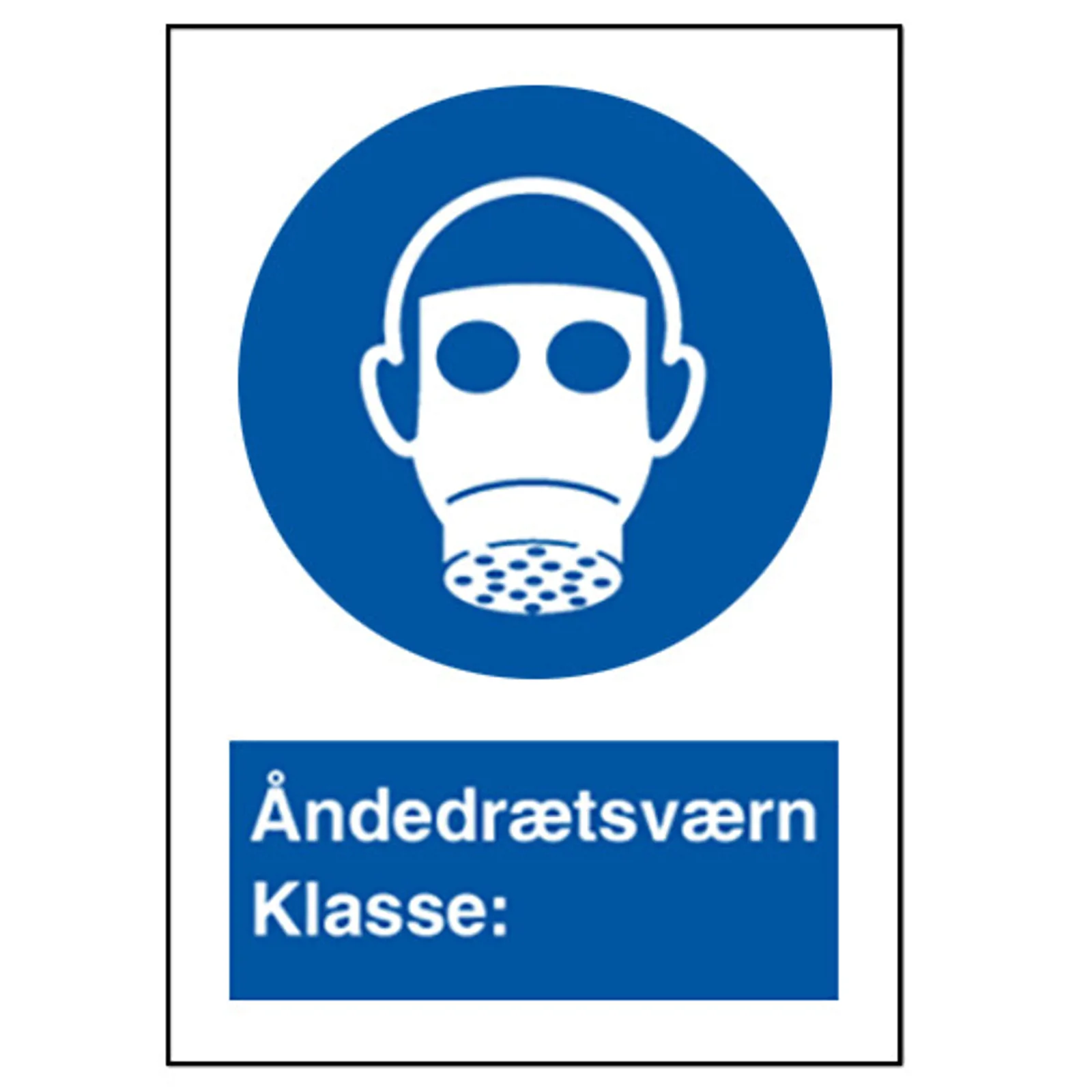 Påbudsskilt med dansk tekst "Åndedrætsværn Klasse:" leveres på plast i størrelsen (A4) 297 x 210 mm. med symbol og tekst.