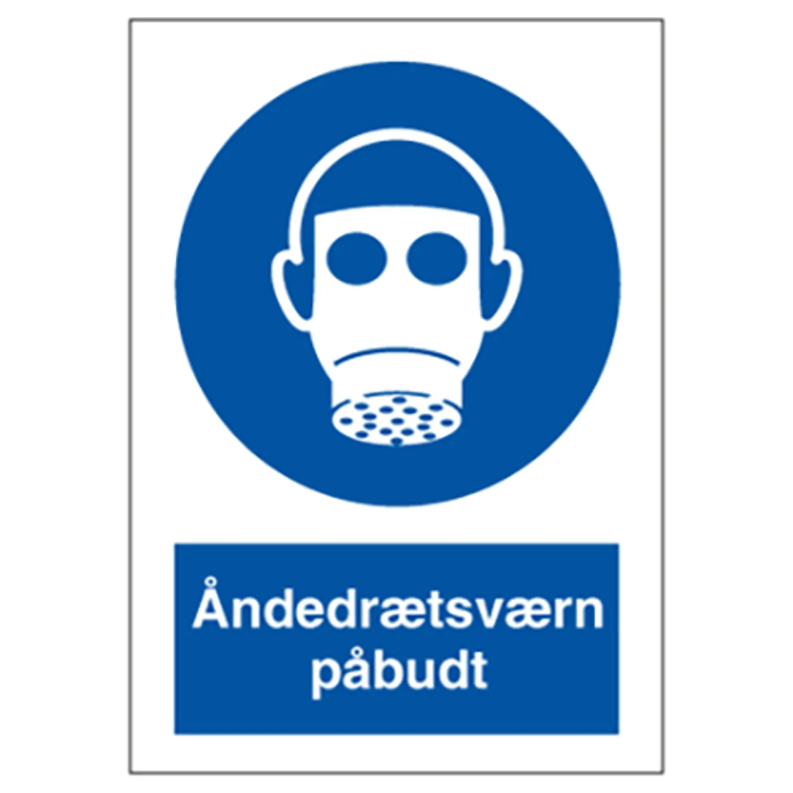 Påbudsskilt med dansk tekst "Åndedrætsværn Påbudt" leveres på selvklæbende vinyl i størrelsen (A4) 297 x 210 mm. med symbol og tekst.