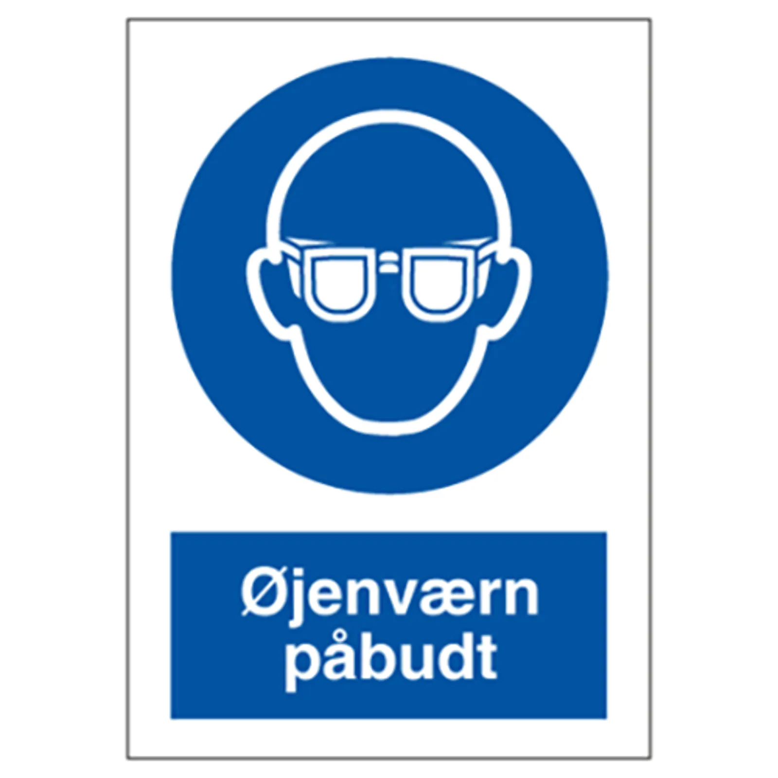 Påbudsskilt med dansk tekst "Øjenværn påbudt" leveres på plast i størrelsen (A6) 148 x 105 mm. med symbol og tekst.