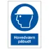 Påbudsskilt med dansk tekst "Hovedværn påbudt" leveres på selvklæbende vinyl i størrelsen (A5) 210 x 148 mm. med symbol og tekst.