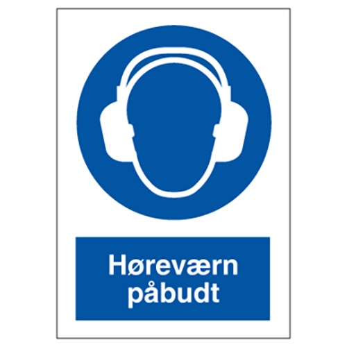 Påbudsskilt med dansk tekst "Høreværn påbudt" leveres på selvklæbende vinyl i størrelsen (A4) 297 x 210 mm. med symbol og tekst.