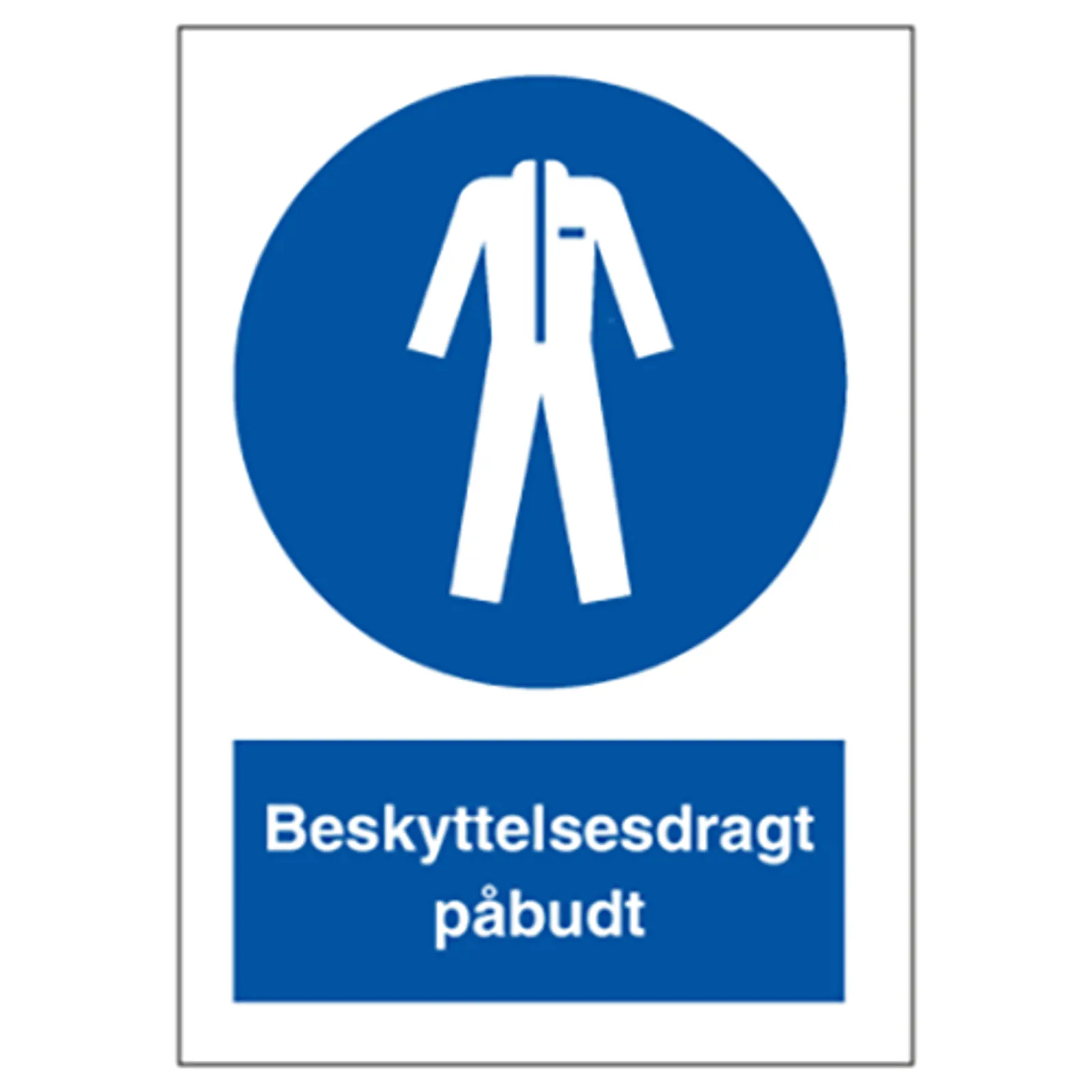 Påbudsskilt med dansk tekst "Beskyttelsesdragt påbudt" leveres på selvklæbende vinyl i størrelsen (A4) 297 x 210 mm med symbol.