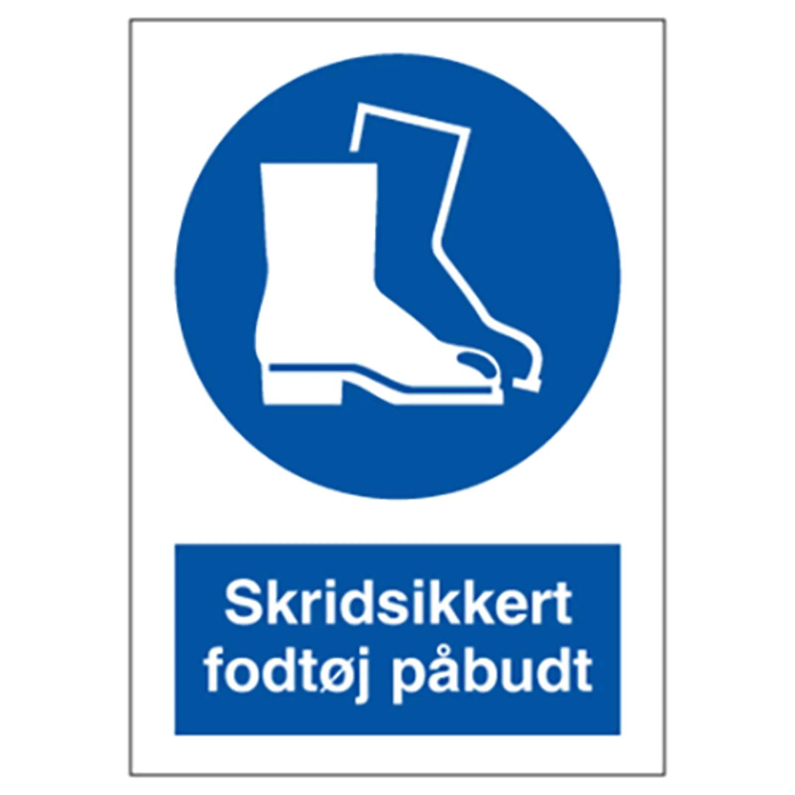 Påbudsskilt med dansk tekst "Skridsikkert fodtøj påbudt" leveres på selvklæbende vinyl i størrelsen (A4) 297 x 210 mm. med symbol og tekst.