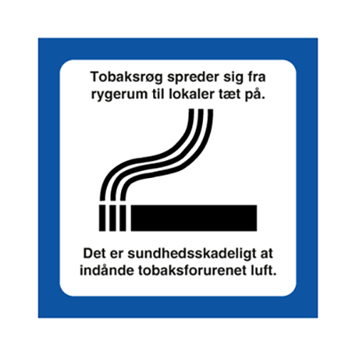 Piktogram med symbol og tekst "Tobaksrøg spreder sig fra rygerum til lokaler tæt på. Det er sundhedsskadeligt at indånde tobaksforurenet luft." leveres på selvklæbende vinyl i størrelsen 100 x 100 mm.